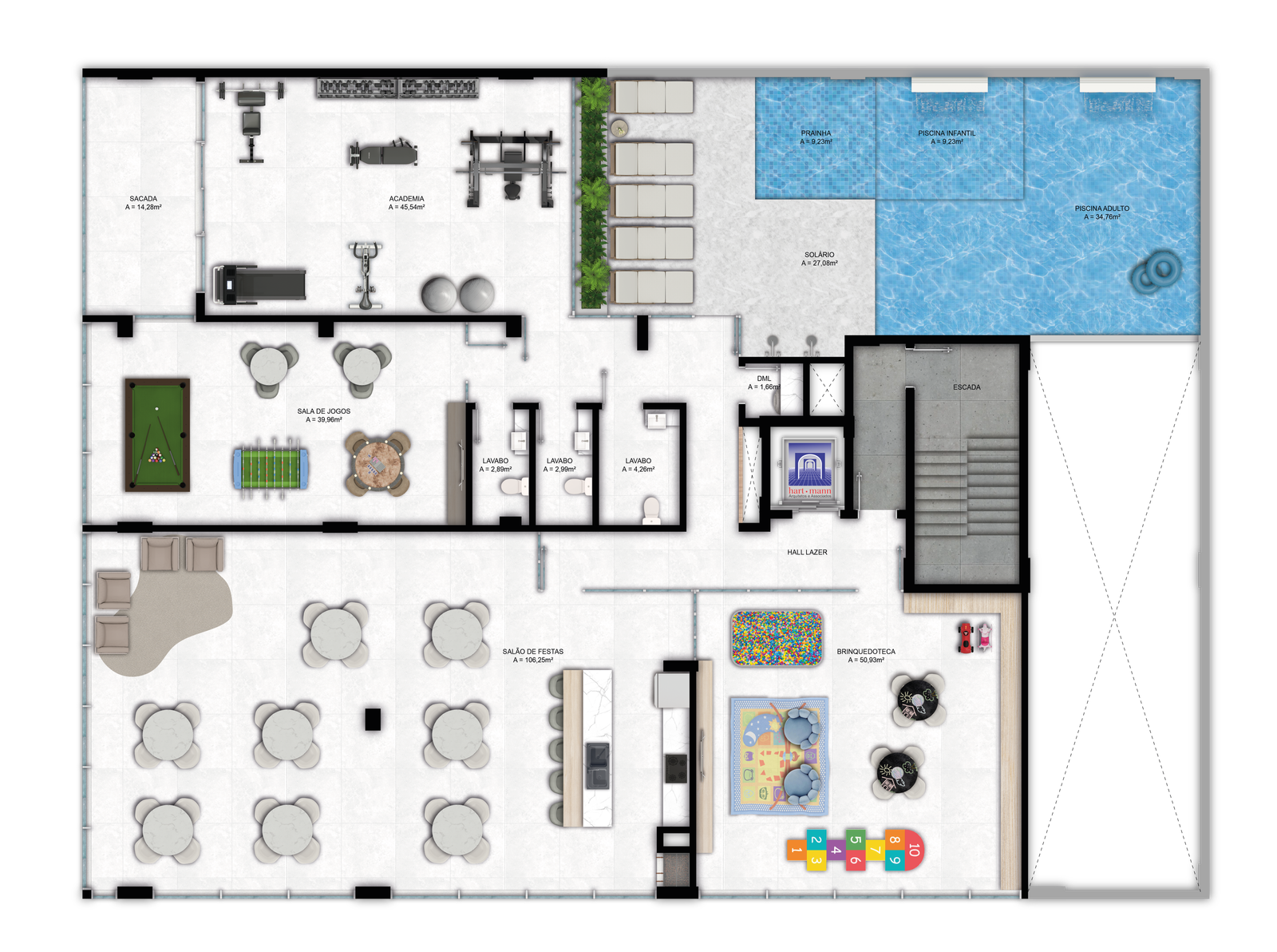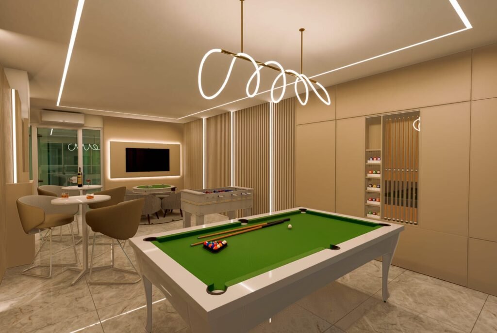 Sabendo que todo ambiente precisa de lazer e opções de entretenimento, preparamos uma área repleta de atividades e posssibilidades para os moradores.